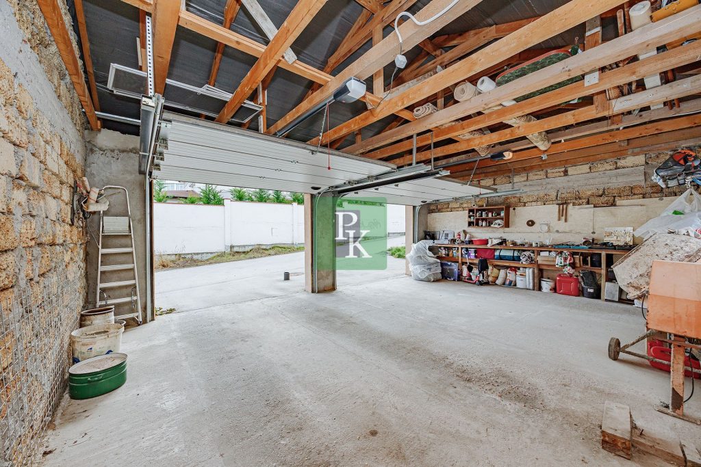 Участок огорожен, на территории есть отдельно стоящая баня, гараж на два автомобиля с автоматическими воротами, хозяйственные постройки.