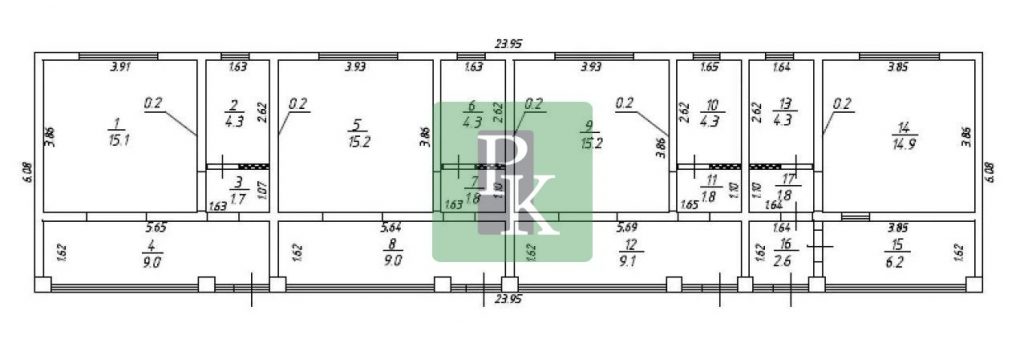 Дом разделен на 4 автономные апартамента площадью 32 м², каждый из которых имеет следующую планировку: просторная кухня, большая спальня, совмещенный санузел, прихожая. Каждый апартамент