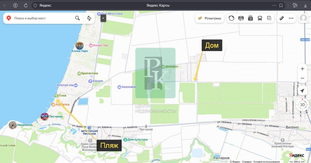Участок находится в с. Песчаное. Вся необходимая для жизни инфраструктура рядом: продуктовые магазины, рынки, школа, аптеки, поликлиника, стоматология, почта, детский сад. До моря с песчаными пляжами 5 минут на автомобиле.
