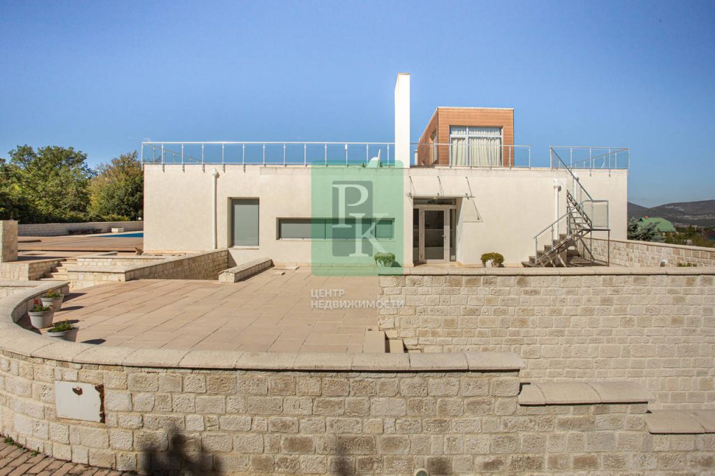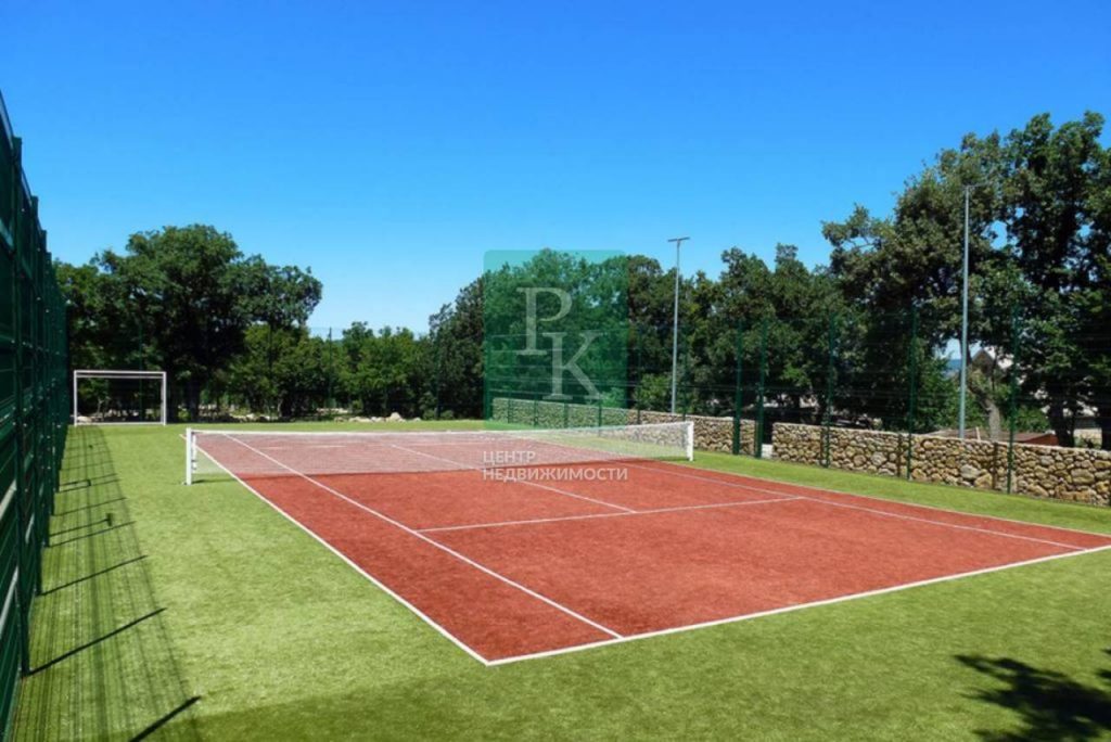 На участке располагаются: основной дом, дом для гостей, дом для обслуживающего персонала, открытый бассейн со СПА процедурами, открытый теннисный корт, римская баня, летнее кафе с барбекю, 2 гаража, стоянка для гостевого транспорта, фонтан, смотровая площадка. На всей территории ландшафтное озеленение, закольцованная система прудов.